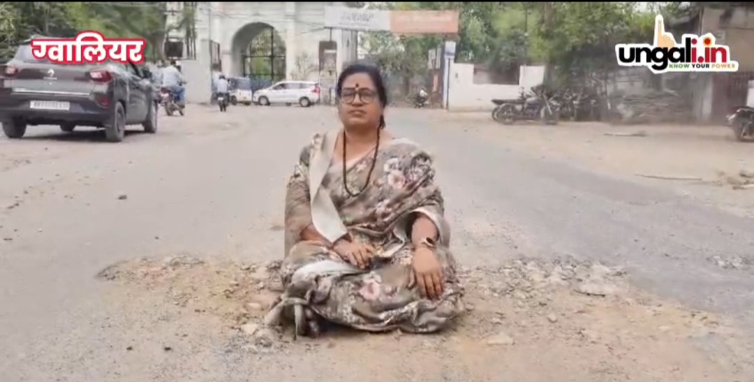 ग्वालियर के सबसे पॉश इलाके की जर्जर सड़क को लेकर धरने पर बैठीं महिला पार्षद_हर रोज चोटिल हो रहे लोग ग्वालियर की सड़कों के गड्ढों से परेशान भाजपा की पार्षद ने खोला सरकार के खिलाफ मोर्चा, सालों से खराब पड़ी है वीआईपी इलाके बसंत विहार की ये सड़क, पहले बारिश का बहाना अब क्या बहाना…